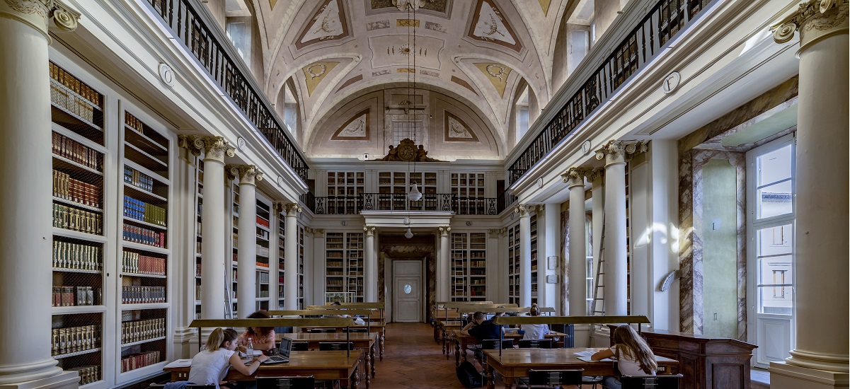 All’interno di particolare interesse sono: l’atrio di ingresso affrescato che ha in una nicchia una pregevole terracotta invetriata raffigurante l'arcangelo Raffaele e Tobiolo, opera di Andrea della Robbia e bottega; la volta della sala lettura impreziosita da un affresco opera di Luigi Catani (1789) raffigurante l’Ozio e la Sapienza (copia da Pietro da Cortona); sempre nella sala lettura da vedere sono le scaffalature lignee con colonne ioniche e due mappamondi del Cinquecento opera di Mercatore (Gerardo Kremer, 1512-1594).